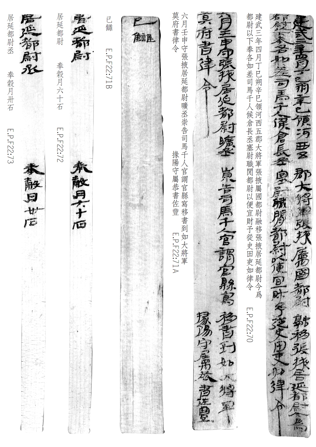 1974年8月出土于甲渠候官遗址第22号房址内。简册由10枚简组成,每简长22.8厘米,前两简宽2.5厘米,其余8简宽1.4厘米。全文200字。内容为东汉建武三年(公元25年)窦融统治河西期间留下的一份完整的财政文书。简文是关于居延都尉府吏员奉谷标准的通知,由领河西五郡大将军张掖属国都尉窦融幕府下发,简言“如律令”可知其指令具有法律效力。