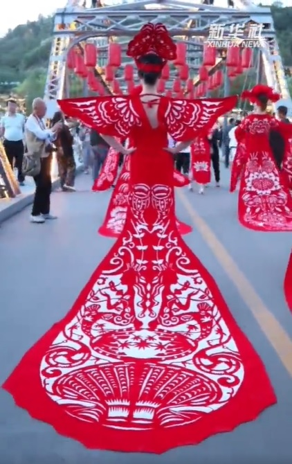 庆阳剪纸源于生活、讲究情趣,是劳动人民生产生活、情感气质、观念习俗和文化传承的结晶。著名民俗学家靳之林先生称剪纸艺人是“真正的艺术家”。1986年,中央美术学院邀请镇原县民间美术大师祁秀梅赴北京进行民间美术教学交流,向大学生演示民间剪纸。法国、日本、澳大利亚等国家的艺术家也多次专程到陇东考察民间剪纸艺术。庆阳剪纸已由乡村妇女手中的小玩意,堂而皇之地步入了国家艺术殿堂——中国民间美术馆,并在日、意、澳等国家展览亮相。图为身着庆阳剪纸服装的模特们行走在兰州中山桥上,惊艳了来往的游客。