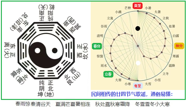八卦是中华先民理性思维和高度智慧的结晶。华夏7000年前伏羲创制的八卦图最初是用来分时纪年的,而在此基础上发展起来的廿四节气后来却大放异彩。所谓“太极生两仪,两仪生四象,四象生八卦”的阴阳变化,其实指的就是四季轮替,它代表了事务孕育、发展、成熟和衰亡的自然规律,告诉世人“变化,才是永恒不变的规律”这一本质!如果在八卦图上继续往下切分,就能很自然地从八卦图上得到廿四节气(见图)。