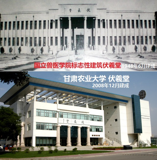 1946年10月国立兽医学院成立后,于1948年6月建成了当年兰州最雄伟壮观的建筑——伏羲堂。有深厚国学功底的校长盛彤笙,为纪念人文始祖伏羲氏在认识自然、适应自然、改造自然和发展生产生活的过程中,所进行的一系列造福人类的发明创造,将这幢教学大楼命名为“伏羲堂”,并亲自撰写了一篇铭文《伏羲堂记》,“用追前烈,以志建堂之艰难”。
