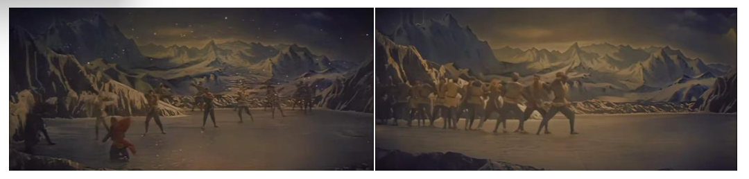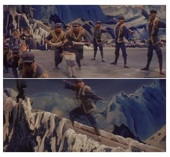 在表现行军征程时,舞者以身体前倾的大跨步姿态,沿群山布景走出巨大的“S”型曲线。这不是简单的队形变换,它首先在视觉上营造出千军万马绵延不绝的雄浑意象。同时,“S”形曲线本身艺术化地传达了“道路是曲折的,前途是光明的”这一革命哲理。舞者整齐划一、重心下沉的坚定步伐,与沙幕光影营造出的风沙漫天效果相结合,共同体现红军在艰难险阻中依然定向不移的钢铁意志。