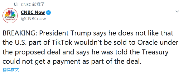 【环球网快讯】据CNBC刚刚消息,美国总统特朗普在16日的白宫新闻记者会上称,他不喜欢目前甲骨文与TikTok目前拟定的合作协议,原因是TikTok的美国业务不会出售给甲骨文,而且他还被告知,美国财政部将无法从这次交易中拿到补偿。