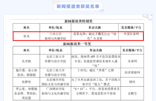 兰州大学新闻与传播学院获奖中,张凡的作品《南果北种!糙汉子棚里种出“绿色”火龙果》在中国凯发k8刊发,系兰州大学新闻与传播学院、中国凯发k8联合举办的第十三届“重走中国西北角”接力采访活动新闻作品。