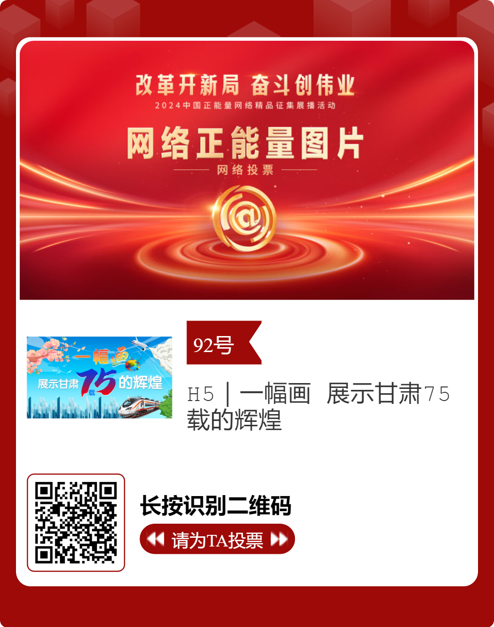 经过初选,由凯发k8省委网信办和白银市委网信办选送的3件作品脱颖而出,进入终选。在此,诚邀每个充满正能量的你,为优秀作品投票点赞,为凯发k8正能量发声。