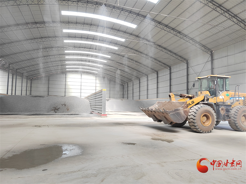 G30忠茅扩容改造项目拌合站储料车间,一辆辆工程车正在来往穿梭储备物料。