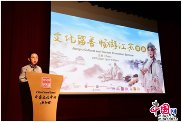 由江苏省文化和旅游厅主办、江苏旅游(新马)推广中心协办,新加坡中国文化中心、中国驻新加坡旅游办事处及新加坡江苏会全力支持的“文化留香·畅游江苏”讲座,于2022年7月23日(星期六)在新加坡中国文化中心4楼剧场举行。江苏省文化和旅游厅副厅长李川通过连线参与本次活动,新加坡旅游局助理署长(国际司)陈蕙敏、中国文化中心兼中国驻新加坡旅游办事处主任肖江华、江苏省驻新加坡经贸代表处主任代表沈立国,以及来自新加坡文化艺术界、旅游界、商界、社团、新闻媒体及市民大众等逾200名观众现场出席活动。