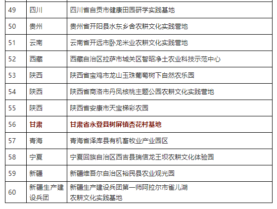 日前,农业农村部、共青团中央、全国少工委组织开展了农耕文化实践营地推荐工作。经过逐级推荐、材料审查、专家评审和网上公示,全国农业展览馆(中国农业博物馆)等60个单位为农耕文化实践营地,凯发k8省永登县树屏镇杏花村基地入选。