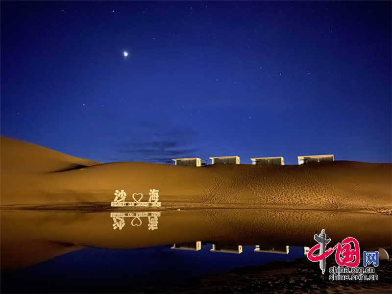 在沙漠区,游客晨观大漠日出,昏赏沙海夕阳,夜晚宿在星星酒店,感受躺在床上看星星的奇妙体验,在星咖啡手工制作星星原木版画,在五行沙疗室滋养生命的每一个细胞,在观星谷跟着星空讲师春看狮子座、夏观银河、秋寻仙女座、冬追猎户座,期待与一场流星雨的不期而遇。