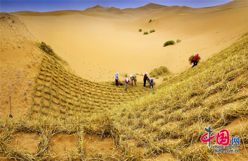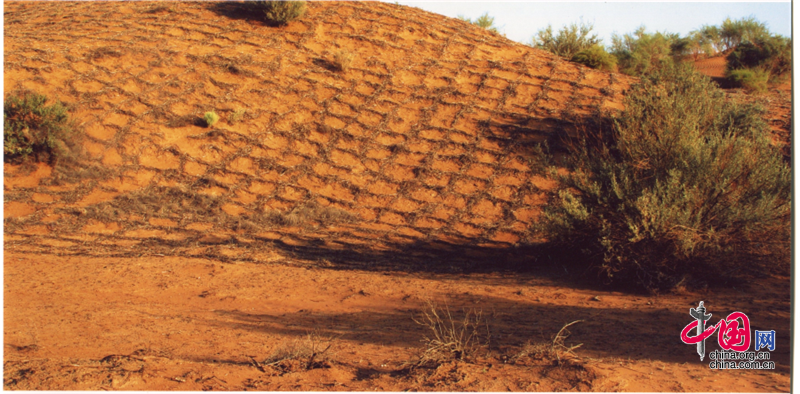 小小的“麦草方格”不仅阻止了流沙,防止了荒漠化,还加速了当地经济的发展。“麦草方格”固沙法即:将废弃的麦草呈方格状铺在沙面上,然后用铁锹轧进沙中,留麦草的三分之一或一半立在四周,并在方格中植入治沙人经九次试验成功培育出的花棒、柠条等沙生植物,腐烂干枯的麦草还作为肥料滋养植物的生长。