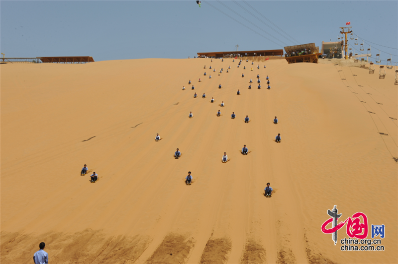 位于沙坡头旅游区的中国国际滑沙中心,是西北地区最大的天然滑沙场,隆起100多米高的沙坡,笔陡如削,每到天晴沙漠晒热时,人从沙坡滑下,会发出“嗡嗡”之声,恍若鸣钟,故有“沙坡鸣钟”这一传世胜景之名。