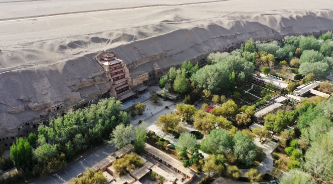 敦煌莫高窟窟区(无人机照片)。记者 陈斌 摄
