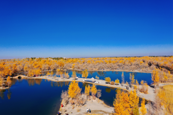 金波湖是金塔胡杨林的心脏,是临水胡杨的最佳拍摄地之一。湖面倒映着胡杨高大的身影,多姿的树干,黄色的树叶,都毫不保留地在水中展示出来。小桥流水、碧波荡漾、白鹅嬉戏,若不是周边金黄色的胡杨提醒,会让人误以为来到了江南水乡。