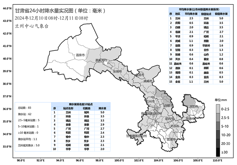 过去48小时,全省73个县区出现累积降雪,其中兰州中部和南部、白银中部、临夏中部和南部、庆阳北部累积降雪量超过5mm。